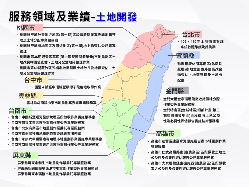 本公司為結合都市計畫、土地開發、測繪作業與地理資訊等各方專業的綜合型工程顧問公司,除可協助夥伴進行開發前各方評估、計畫擬定,亦可在主管單位核發許可後接續進行測繪工程與土地開發業務,達成工程階段前的一條龍統包作業模式,除可快速無落差的完成夥伴要求,亦可協助夥伴降低業務銜接上的成本與落差風險。歡迎有興趣的合作伙伴與我們聯繫。